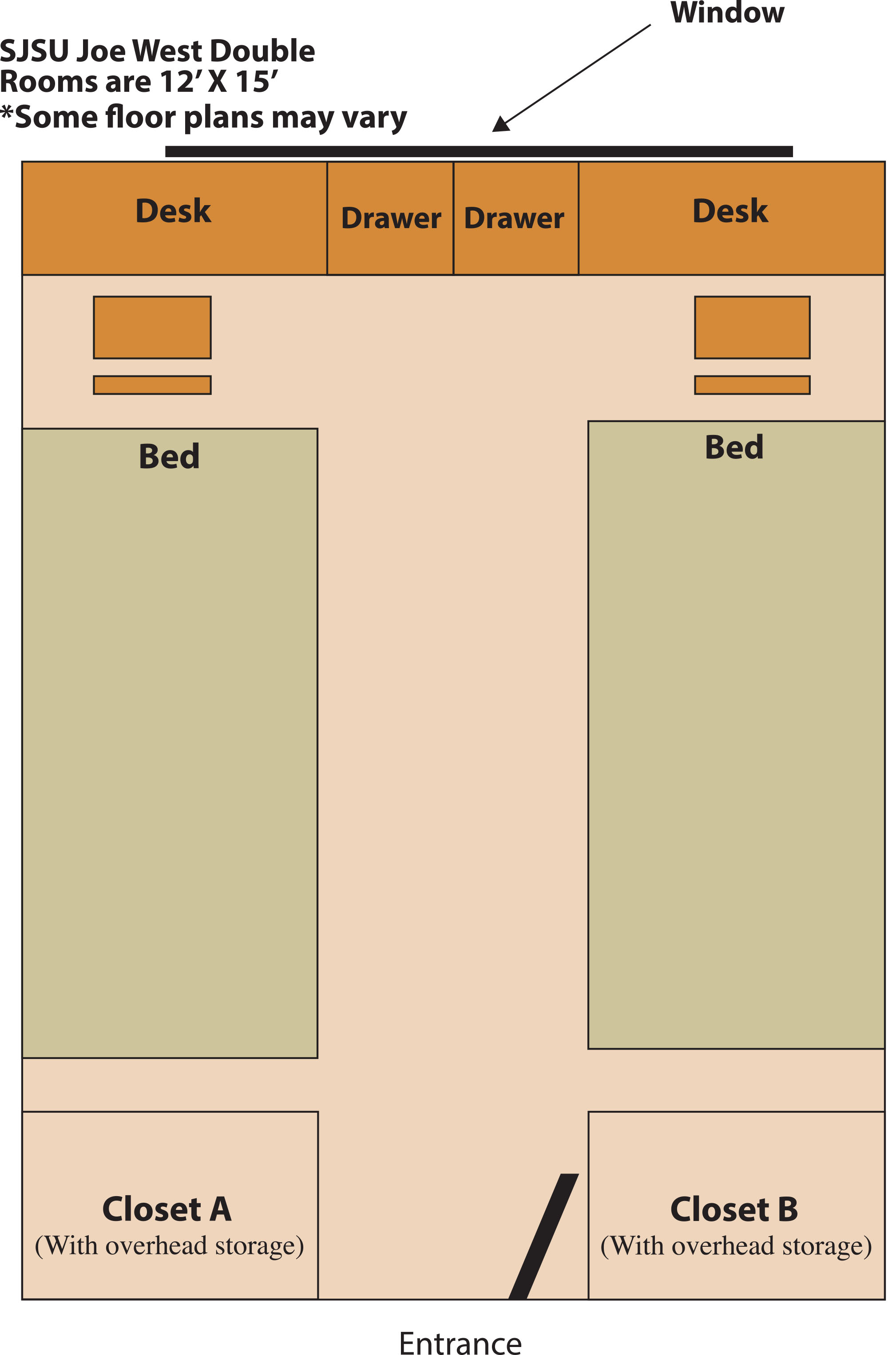 Double occupancy rooms are furnished with two of each of the following: extra long twin beds, desks, chairs, dressers, bookshelves, and closets. Triple rooms are furnished with three of each of the above (only two closets and bookshelves). Each room includes one towel rack, wastebasket, and paper recycling bin. Floors are carpeted, and windows are furnished with drapes.